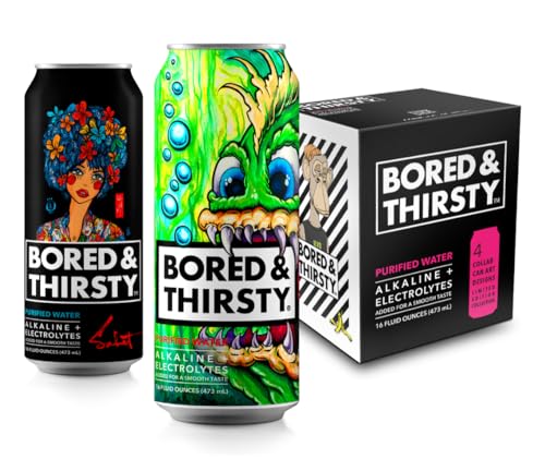 Bored & Thirsty Ionized Alkaline Water with Electrolytes & Trace Minerals for a Smooth Taste. Limited Edition Art Collabs 100% Recyclable 16 Fl Oz Aluminum Cans (4 Pack). Stop Single Use Plastic!